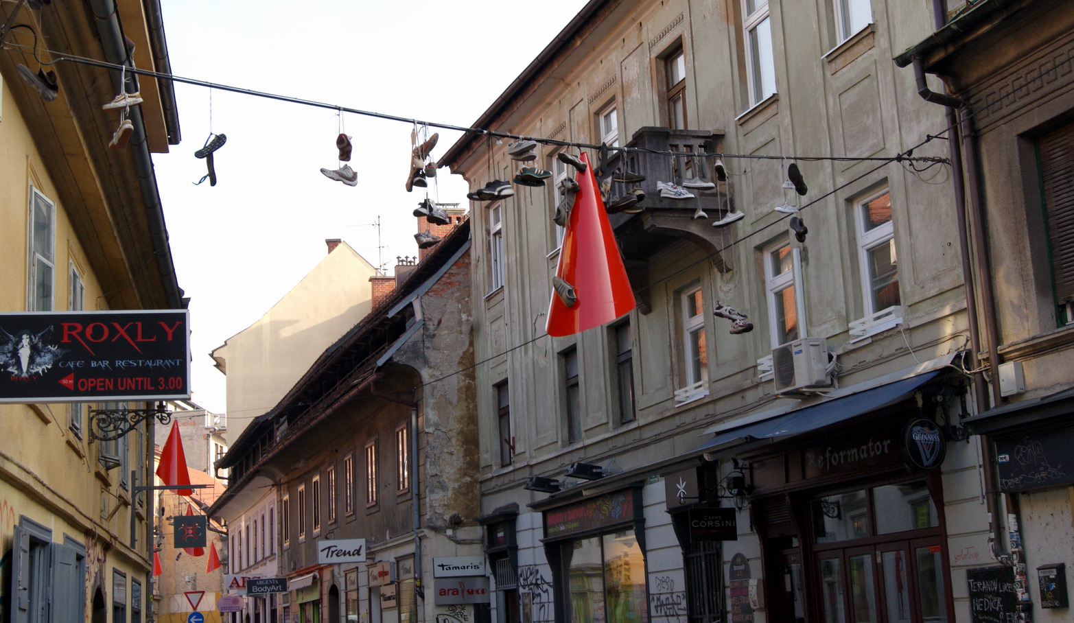 6. Liubliana – Eslovênia; algo bem curioso em Liubliana são os calçados pendurados pela cidade.