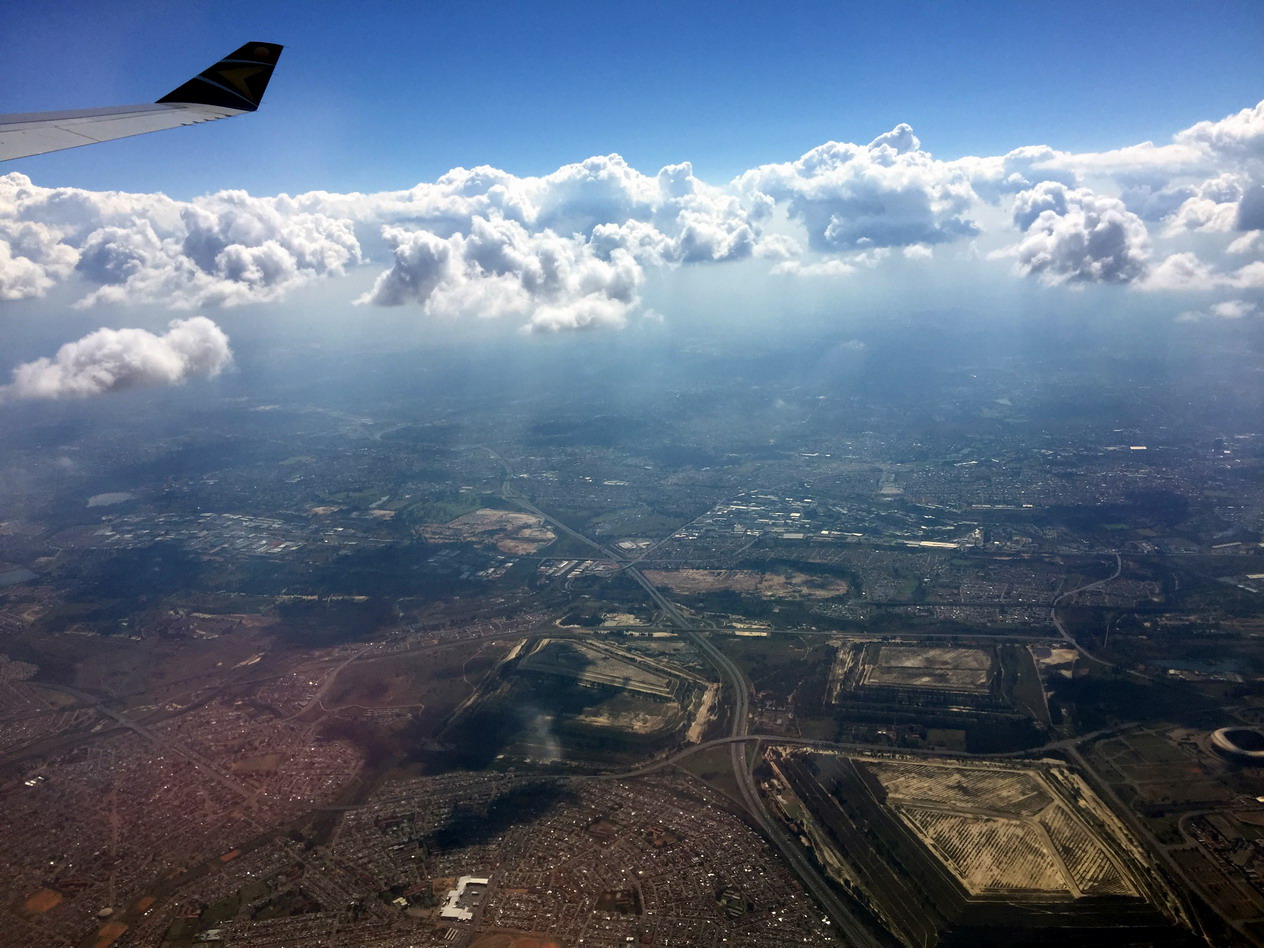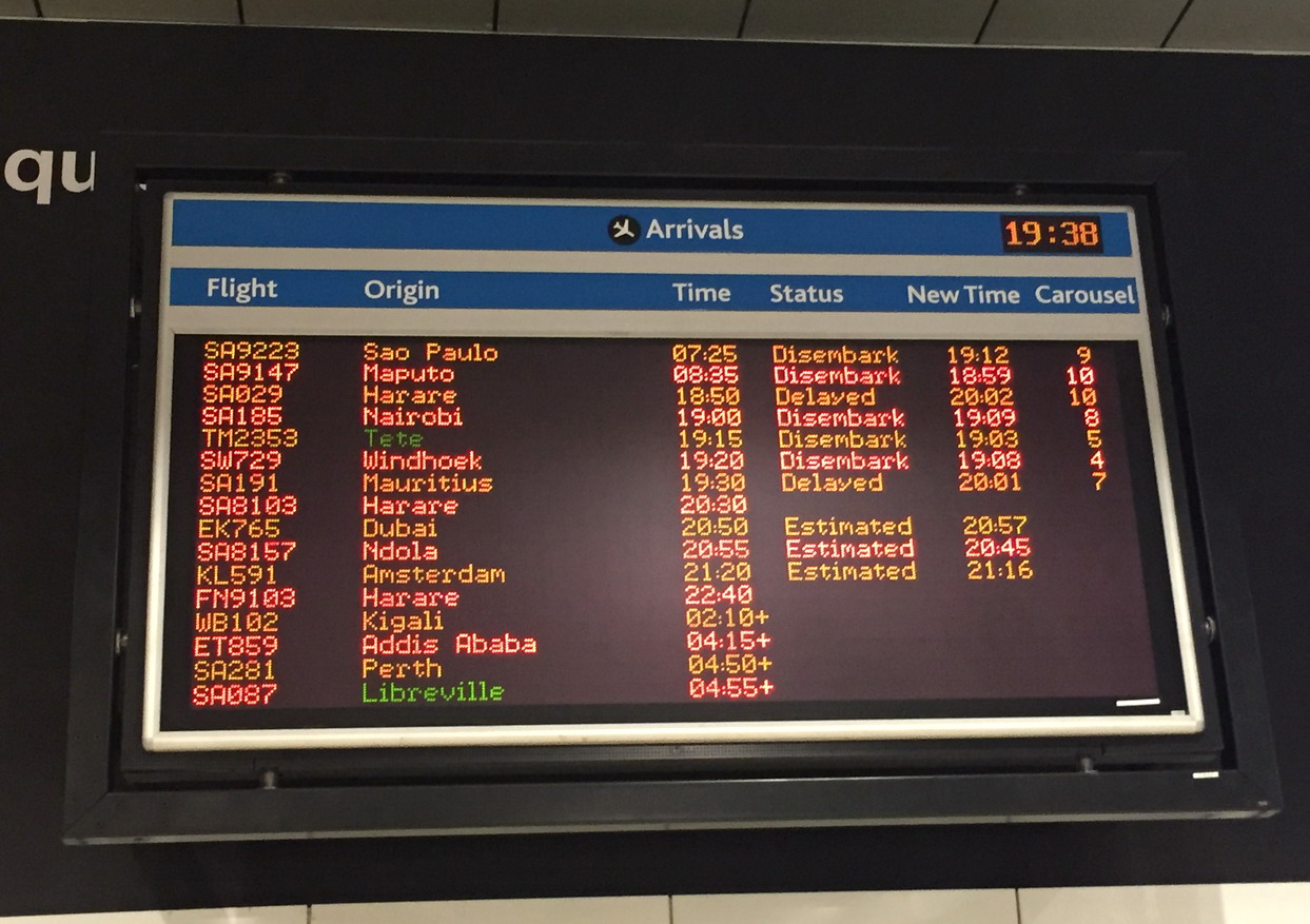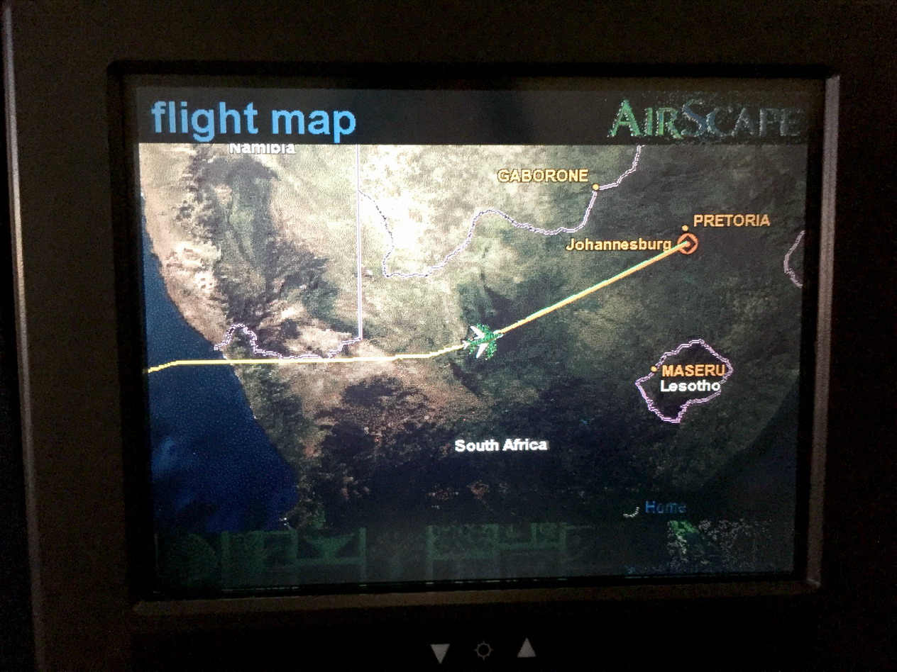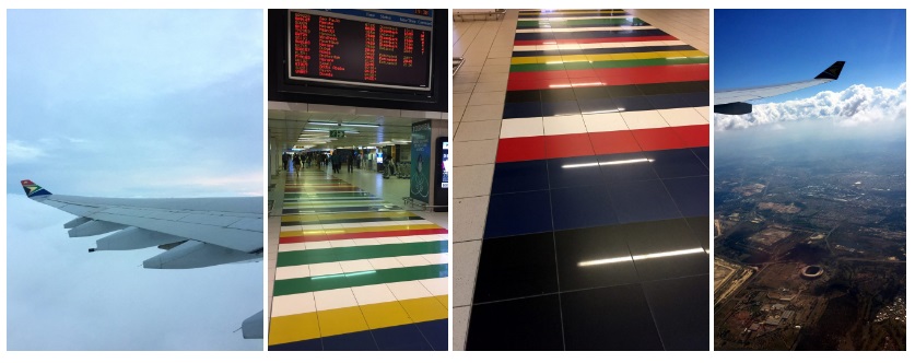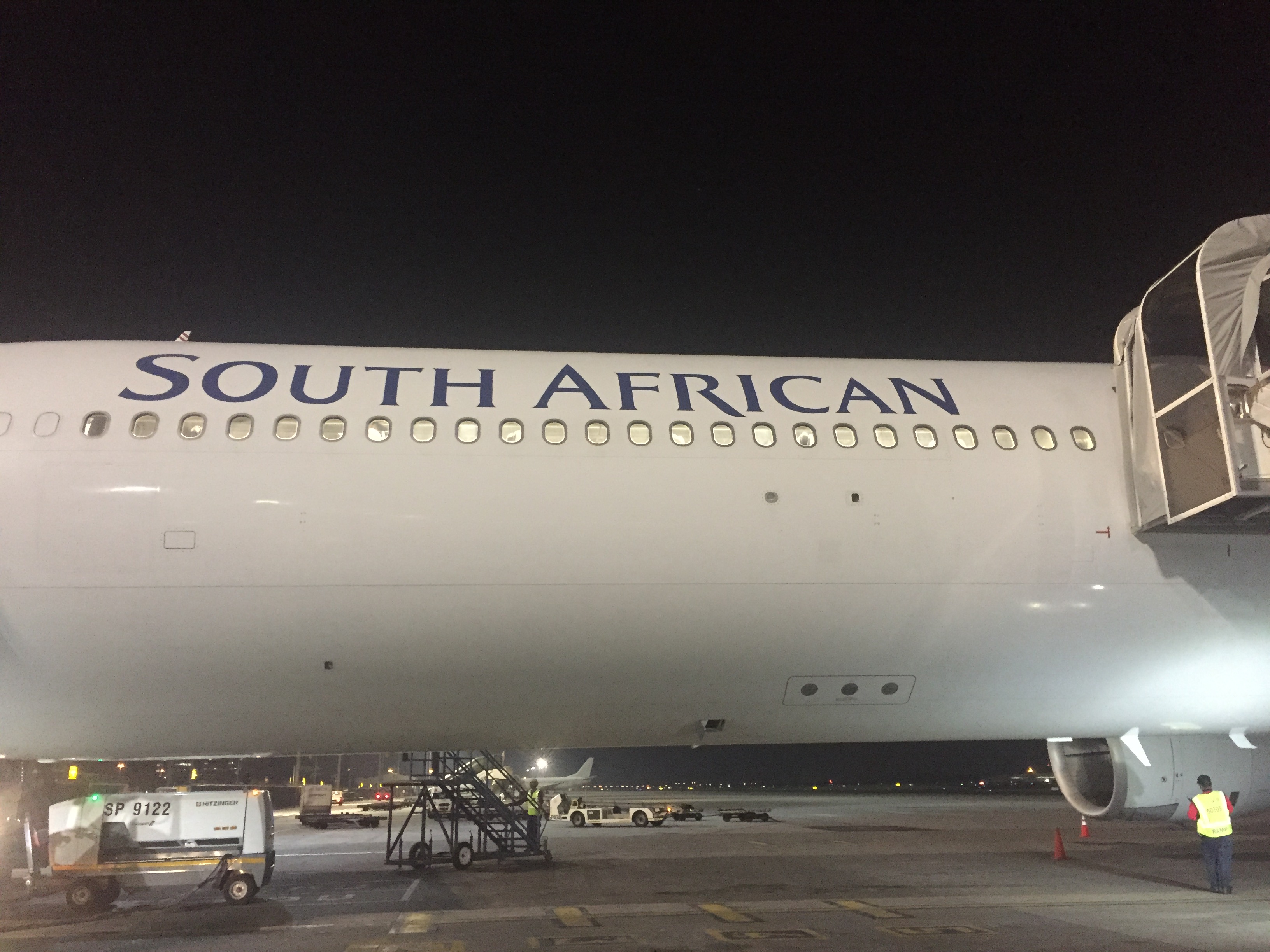 Saindo de São Paulo voamos até a África do Sul pela South African Airways (SSA), infelizmente nosso voo estava atrasado em 8 horas, então o voo que sairia às 18hs da tarde saiu somente as 06 horas da manhã do dia seguinte, perdemos praticamente um dia da nossa viagem.