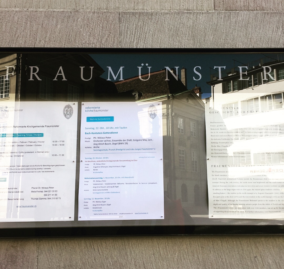 Fraumünster – Aqui estão os famosíssimo vitrais de Chagall e Giacometti, fundada em 853 pelo imperador Ludwig, a Fraumünster foi um dos lugares que mais adorei conhecer.
