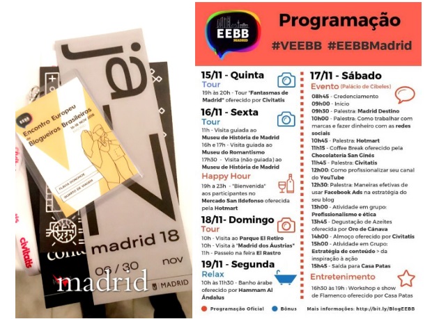 No final do mês de novembro de 2018 foi realizado em Madrid o 5º Encontro Europeu de Blogueiros Brasileiros. Dos dias 15 a 19 de novembro o evento reuniu 50 blogueiros brasileiros que vivem na Europa e compartilham suas perspectivas e vidas no continente. Foi uma experiência incrível de muito conhecimento, experiências, networking e aprendizado.