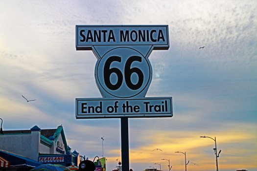 o clássico letreiro do final da rota 66 na praia de Santa Mônica.